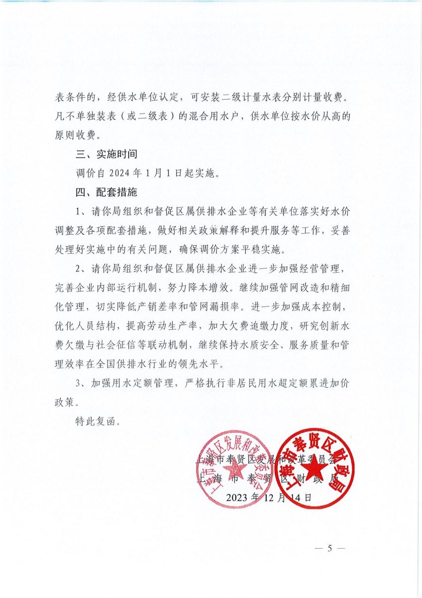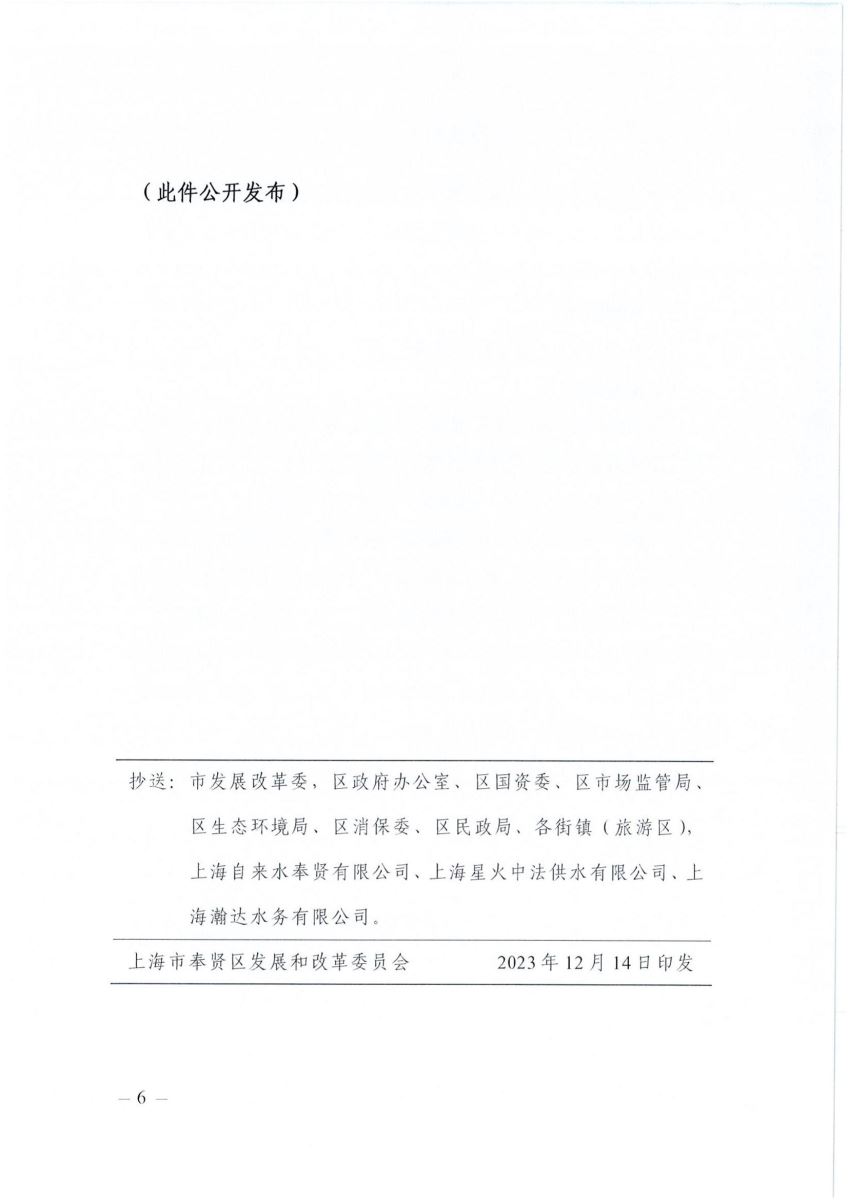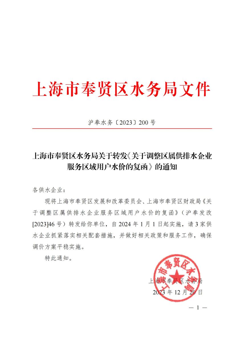 上海市奉贤区水务局关于转发《关于调整区属供排水企业服务区域用户水价的复函》的通知