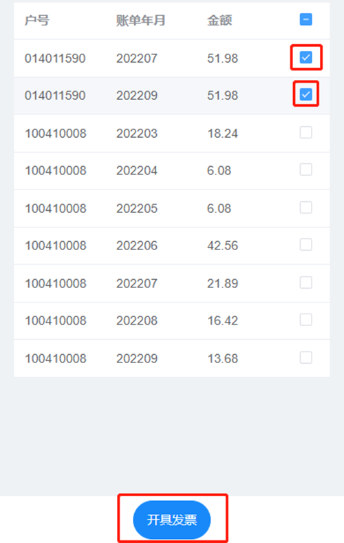 8、勾选需要开票的账单,点击开具发票